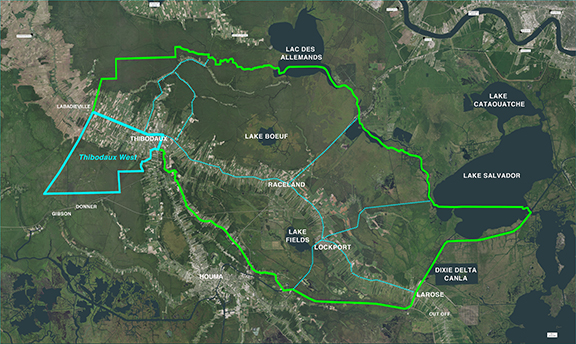 The boundary of the Thibodaux West Project Area is the area enclosed by a polygon beginning at the Lafourche Parish line from Bayou Lafourche at the northern most part of the Parish going southwest to the western most point (corner) of the Parish. Then it goes east, north and then east again along the Parish line. From this point the boundary meanders generally northeast along the Parish line to Canal Blvd where it then continues east and then southeast along the Parish line to the top of the Acadia Ridge. The boundary then follows the Acadia Ridge north to the Percy Brown Road where it continues towards the northwest then west along the Acadia Ridge (old railroad corridor) across Canal Blvd, along Lawrence Avenue to Ridgefield Road. The boundary then continues northwest up west bank of Bayou Lafourche to the point of beginning.